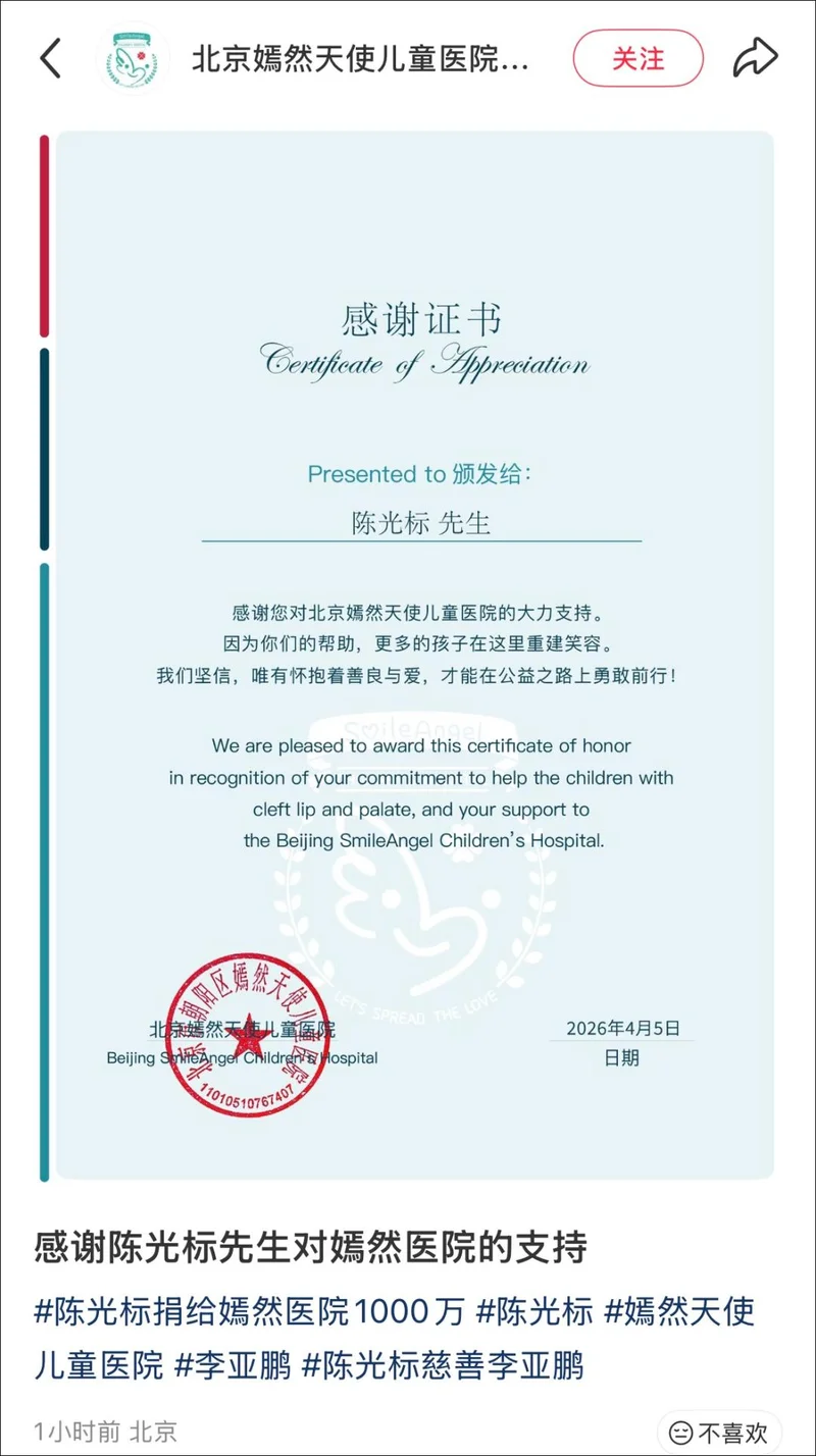 4月7日,“北京嫣然天使儿童医院体检中心”官方账号发布颁发给陈光标的感谢证书。