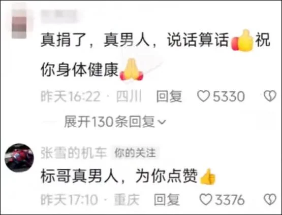记者注意到,张雪也在该视频下评论称:“标哥真男人,为你点赞。”