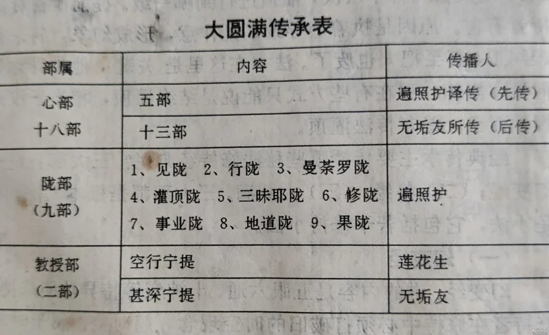 根据最新国内外藏学研究成果, 在旧密时代, 有苯密和藏密, 分不清时代, 称为密法混合期, 就出现了《大圆满顶上经》和《大圆满密咒三部》两部经典。大圆满经典分: