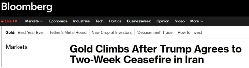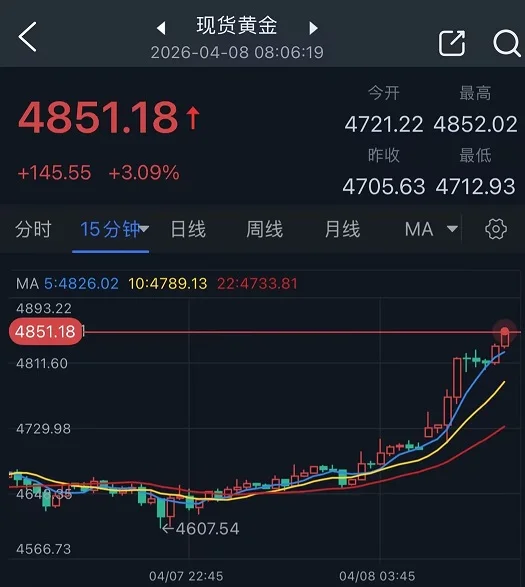 现货黄金价格目前升至4851美元/盎司附近,日内暴涨逾145美元。特朗普在社交媒体发文称,他已同意暂停轰炸,这距离他自行设定的“摧毁伊朗整个文明”的最后期限不到两小时。油价暴跌、美元走弱,对金价形成支撑。