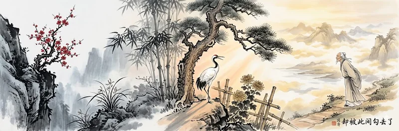 前六句所写,梅兰竹菊松鹤,孤标、独逍遥、玄理、机巧,皆老夫自撑之架子、自诩之风骨也。末二句方是实话:“自笑平生称孤老,却被此间勾去了。”