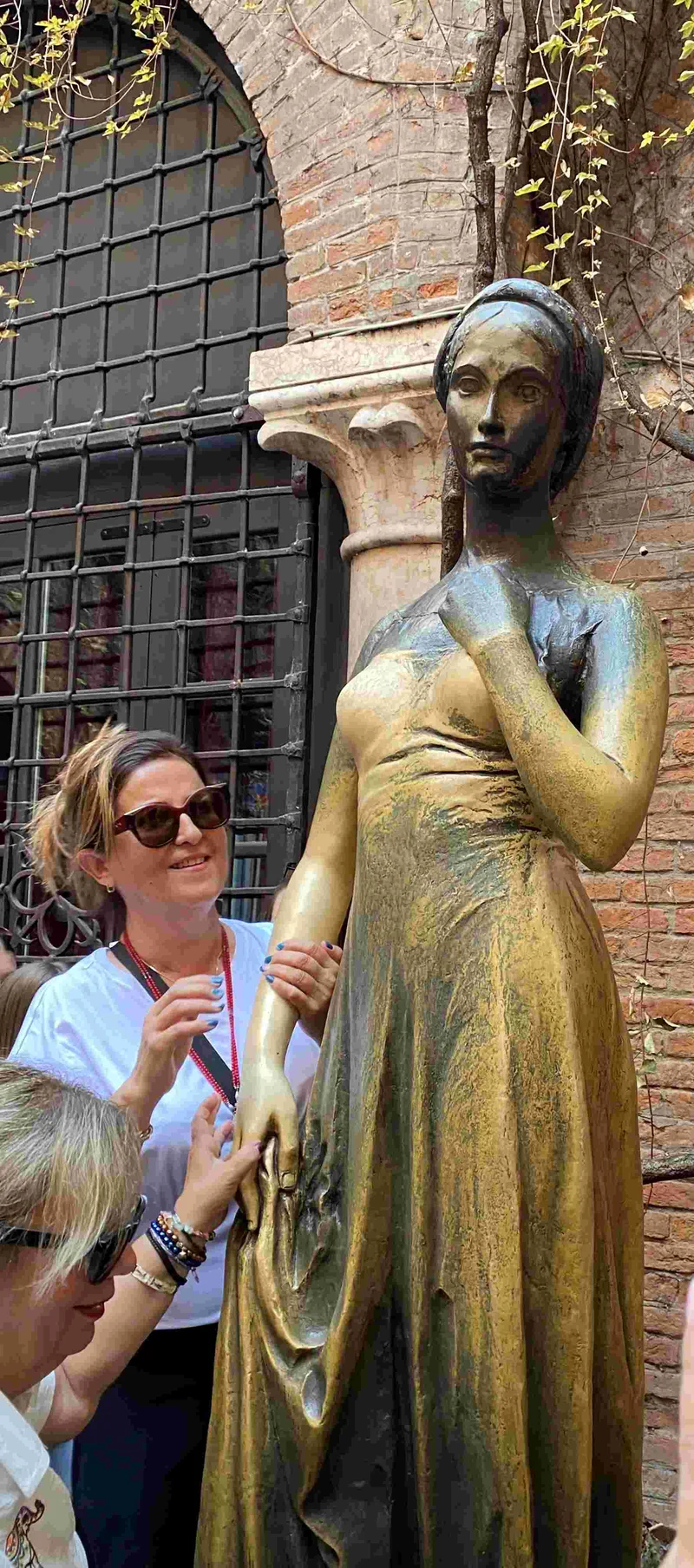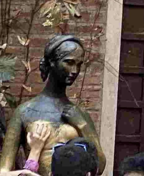 在慕尼黑时,也曾见到一座由维罗纳赠送的朱丽叶铜像,也见有人上前抚摸以保佑自己的爱情,但没有在维罗纳的这座这般猛烈。据说维罗纳也赠送了一座给杭州,不知那里的朱丽叶的遭遇如何?