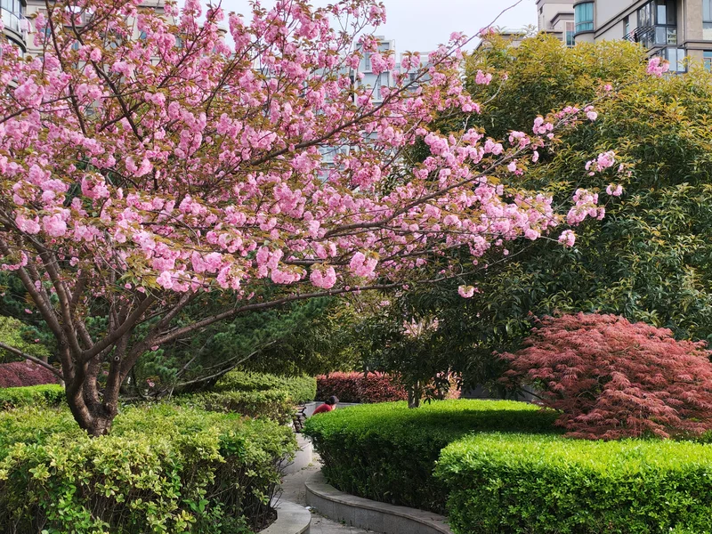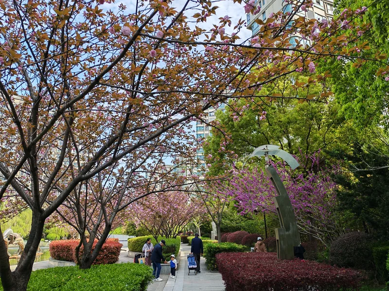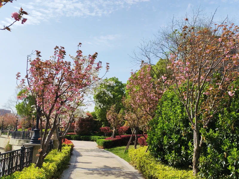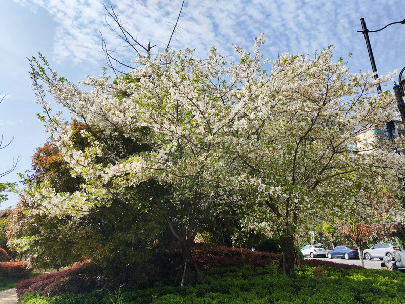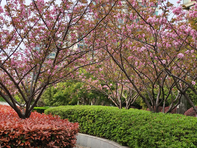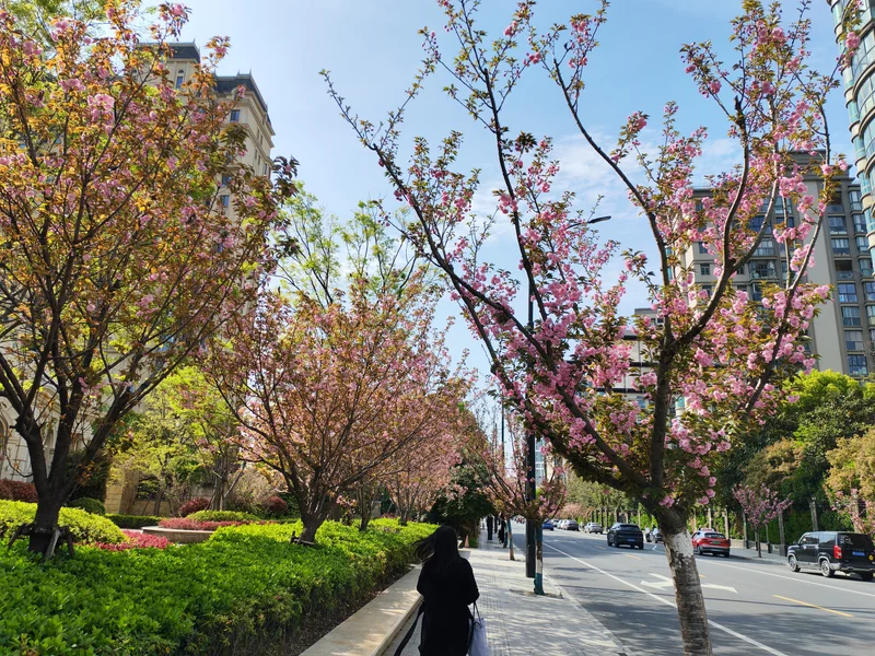 上海的樱花也到了赏花季节,我们小区就有不少,路边几年前也种上了樱花。我查了下豆包,白色的叫染井吉野樱属于早樱,偏红色的,花朵大些叫关山樱(重瓣晚樱)。现在红红、白白的成片开花,很是好看,樱花花期不长,除了树上开的,花瓣也随时飘落,所以弄得地上也是红红、白白一片,树上的花,地上的花瓣告诉大家,春天快将过去,夏天就要来了。