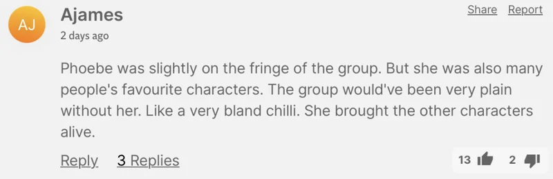 “菲比在剧组里有点边缘化。但她也是很多人最喜欢的角色。没有她,这个剧组会很平淡,就像一颗寡淡无味的辣椒。她赋予了其他角色鲜活的生命力。”