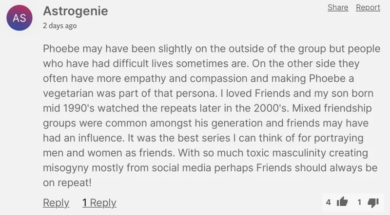如今,充斥着有毒的男子气概,社交媒体上充斥着厌女症,或许我们应该永远循环播放《老友记》!”