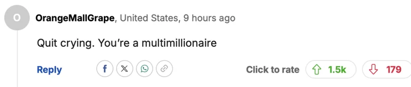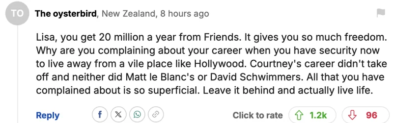 不过,对于Lisa年过六旬谈到自己当年在剧组被有意无意“孤立”的言论,评论区网友觉得——最好别在大量收益之后这样倒苦水吧:
