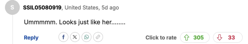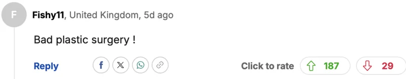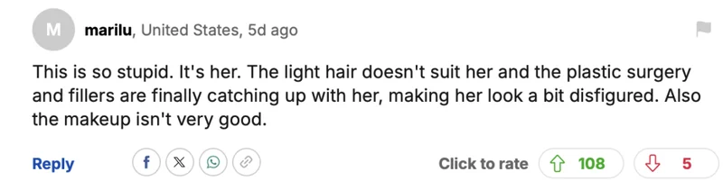 “这太蠢了。就是她本人。浅色头发不适合她,整容和填充终于开始显现效果,让她看起来有点毁容。而且妆容也不怎么样。”