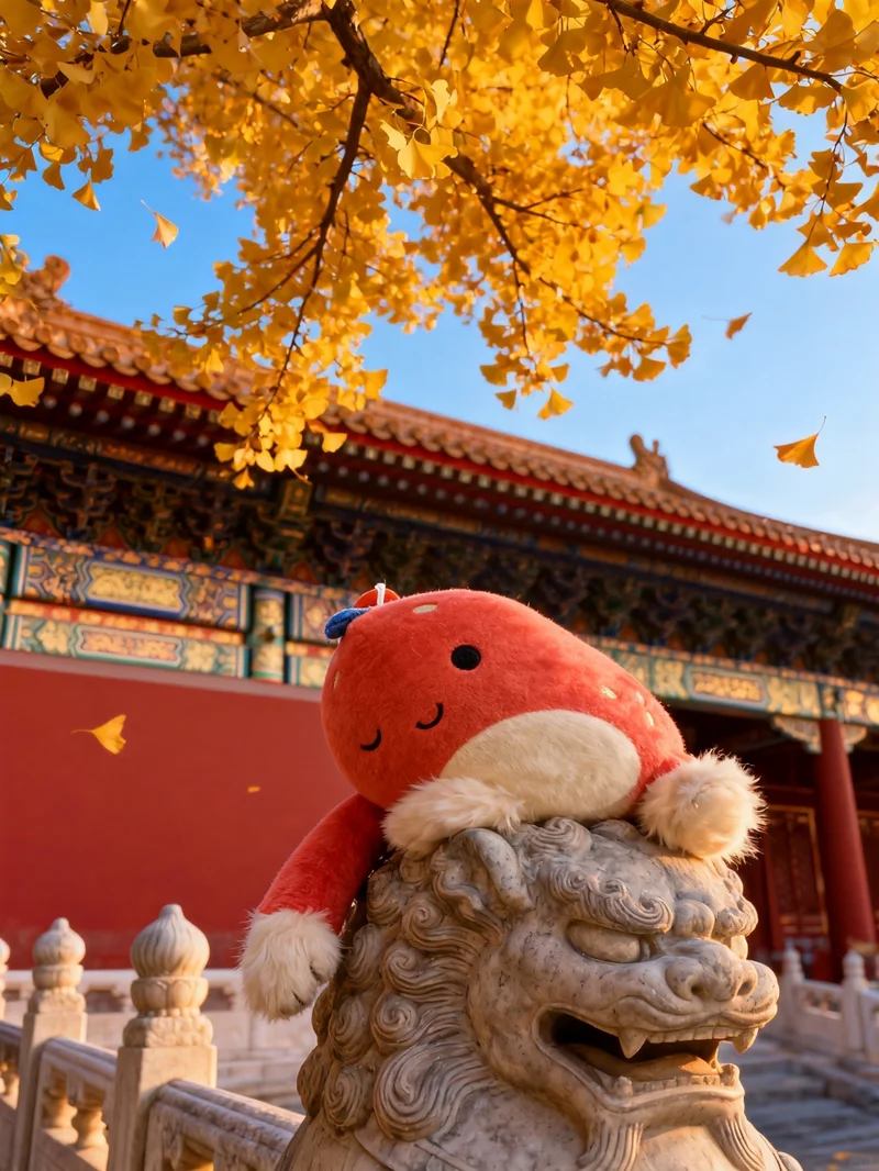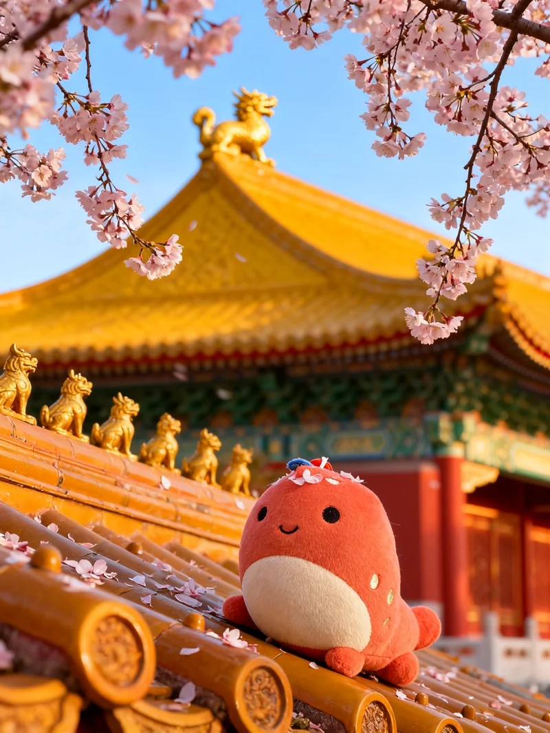 春光大好的日子里,故宫的琉璃瓦被晒得暖融融的,檐角的瑞兽们正打着瞌睡,一只圆滚滚的【小团子】,正小心翼翼地从檐下爬上来。它是从千里之外的山海间来的,顺着春风一路寻来。粉白的樱花落了满身,【小团子】像被撒了一把甜甜的雪。抬头望去,檐角的金兽们正睁着圆溜溜的眼睛看它,远处的重檐飞阁在蓝天里闪着光,红墙映着花影,连风里都裹着千年的温柔。