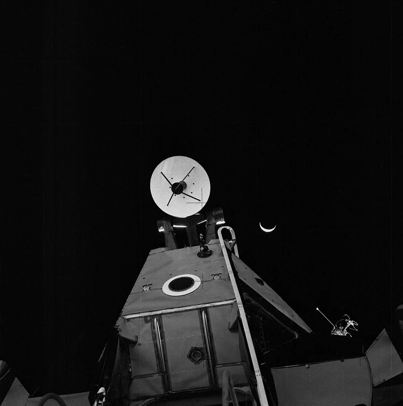 这张是阿波罗11的指令舱驾驶员迈克尔·柯林斯在指令舱内拍摄的地球及开向月球准备着落的登月舱的照片