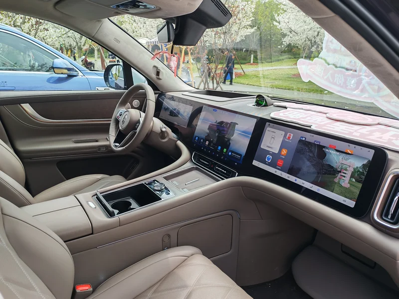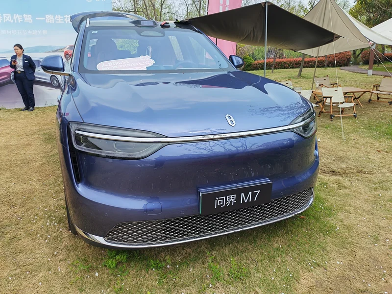 公园里还有蹭人流,展示“问界”新车的。问界用的是华为全方案解决软件,华为不造车,只提供软件。到车里试坐了下,宽畅、舒适。跟销售员聊了聊,M9约人民币50多万,折成美刀约7万多。M7稍便宜些。