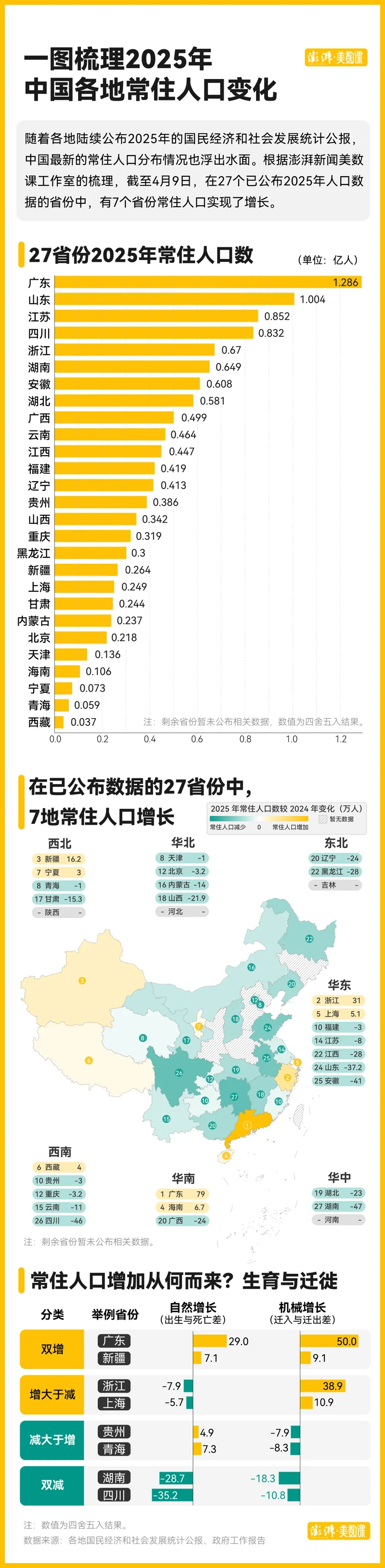 近期,多个省份陆续披露2025年的人口数据。截至4月9日,已有27个省份公布了常住人口数据。