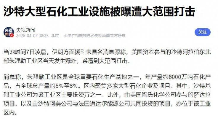 沙特朱拜勒工业区,全球6%到8%的石化产品从这里产出,4月7日,伊朗的导弹精准砸向了这里。