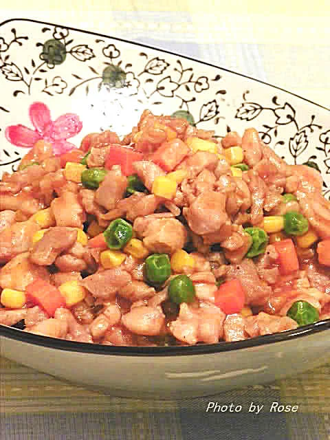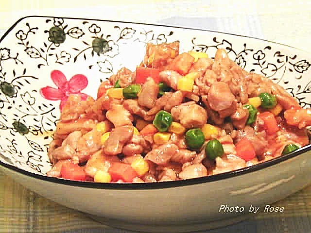 一定要炒好味汁,才倒入鸡肉和蔬菜粒,这样使汁更加均匀和有光泽。