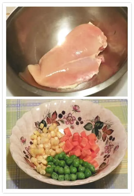 二、将红萝卜粒、玉米和青豆焯水,焯水时各加1茶匙盐和油;
