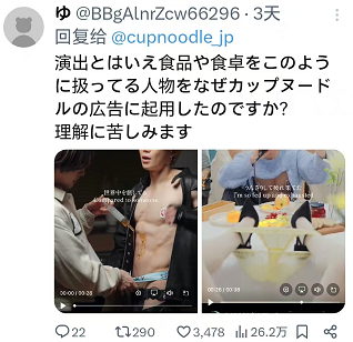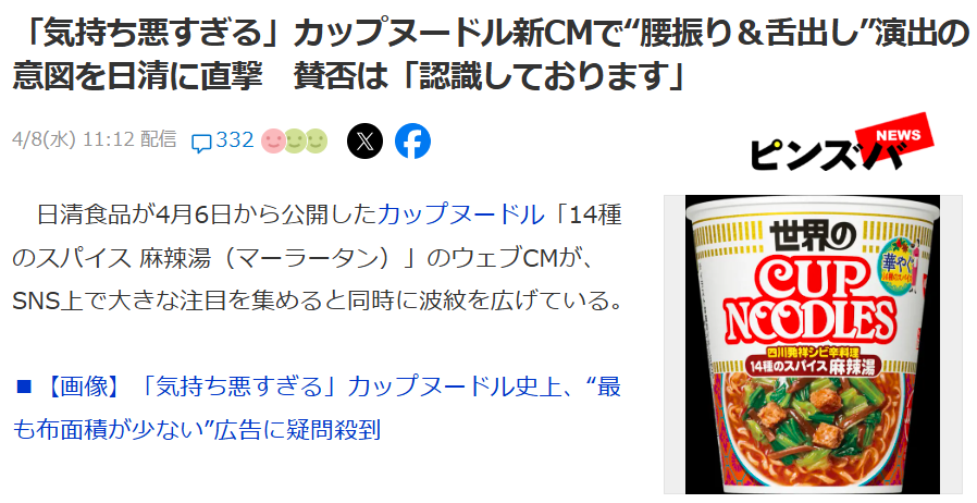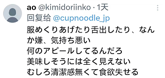 不少日本网友都表示实在搞不清楚日清到底是怎么想的,为什么要让美食搭配这样令人不适的的画面。“虽说是表演,但为什么要起用这样处理食品和餐桌的人物来做泡面广告呢? 难以理解。”