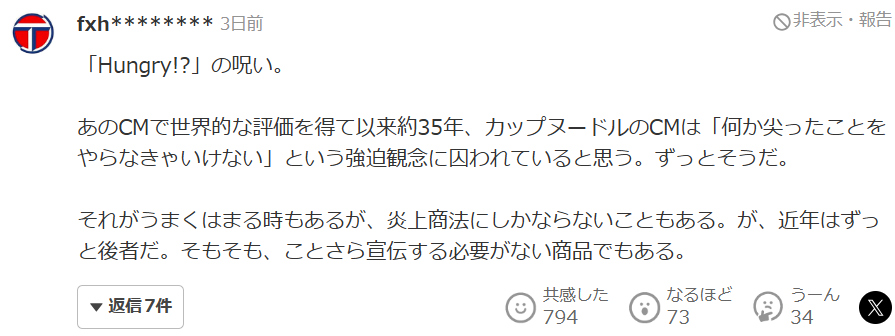 “‘Hungry!?’的诅咒。那个广告获得世界性的评价以来约35年,方便面的广告被困在“必须做些尖锐的东西”的强迫观念里。一直如此。