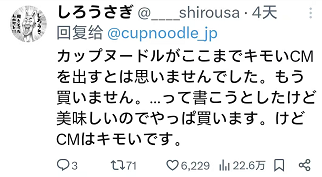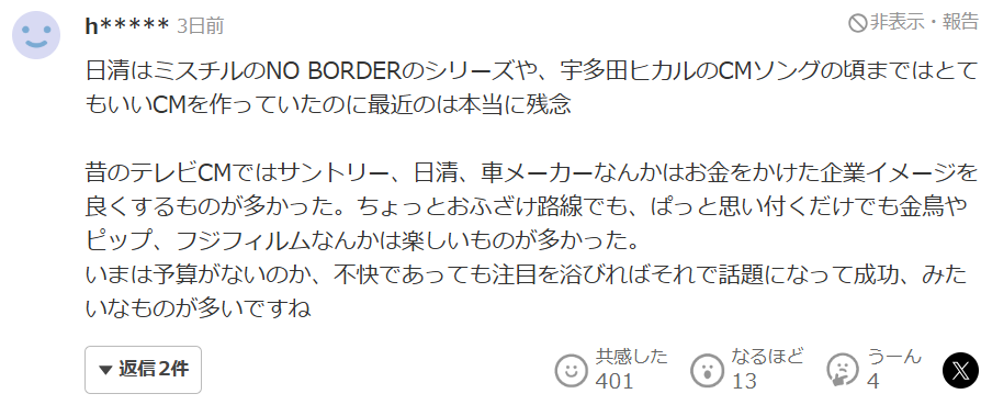“日清在mr . children的NO BORDER系列和宇多田光的广告曲的时候都能制作出非常好的广告,最近的真的很遗憾。在过去的电视广告中,三得利、日清、汽车制造商等投入大量资金打造良好的企业形象。虽然走的是搞笑路线,但只要一想起来,金鸟、pip、富士胶卷等就有很多好玩的东西。