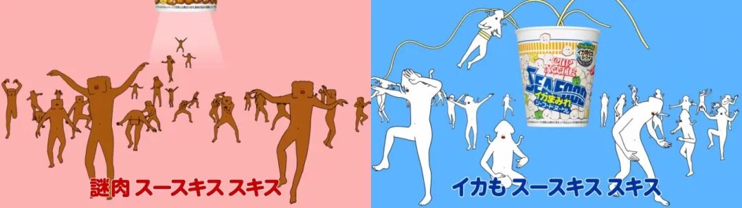 搭配的广告就是这条超魔性的“我喜欢配菜”广告,主角是形似”肉”和”鱿鱼“的魔性舞者,它们一会儿在面条中穿梭,一会儿带飞,结尾台词却落在了“但是普通的更好吃,两个都买!”,简直是营销鬼才。