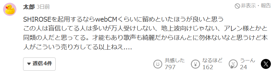 而这一次,日本网友表示知道日清请SHIROSE就是为了搞话题,但真的不好看,下次别再这样搞了。“如果要请SHIROSE来拍的话,我认为最好就用于网络广告好了。这个人有很多盲目相信的受众,但不受万人欢迎,不适合无线电视,和艾伦先生等人是同类的人。有才能,歌声也很好听,我觉得真是太可惜了但是本人却以这种方式来推销自己....”