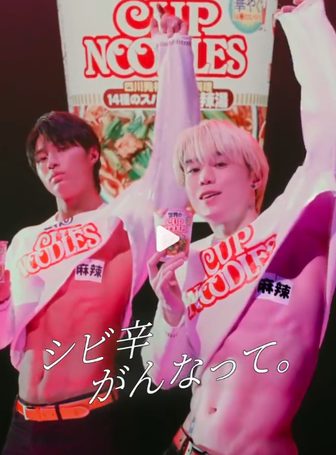 答案揭晓:这是一个拉面广告。这支广告是为日本国民级拉面品牌日清杯面为推出的新商品“14种香料麻辣烫”推广而拍摄的。而广告中的两人一位是曾为SnowMan、岚等人气团体提供乐曲的创作歌手组合WHITEJAM队长兼主唱SHIROSE,另一位则是健美选手兼艺人榎田一王。