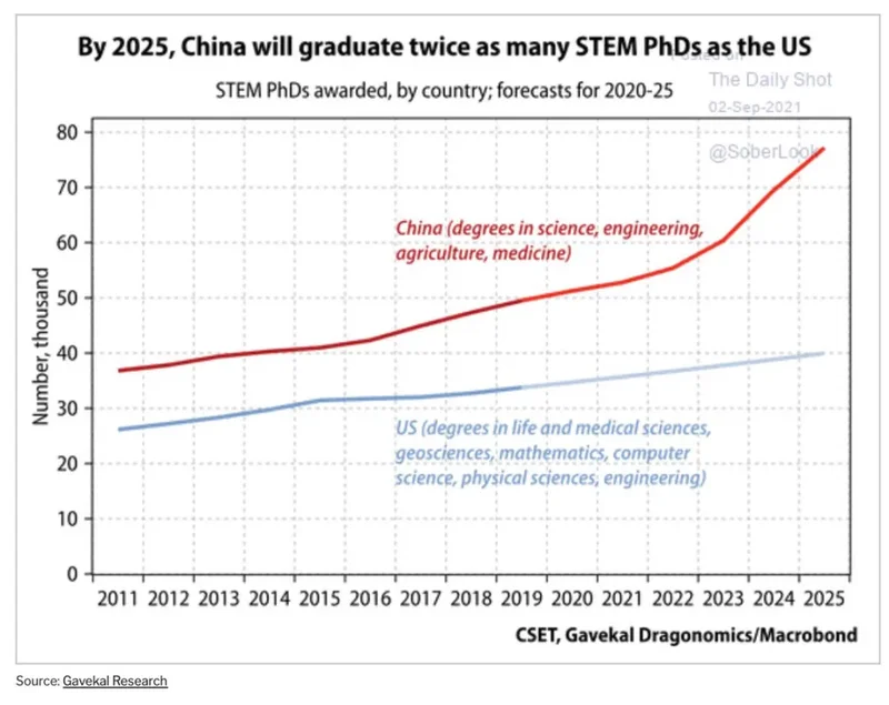 中国目前每年培养的STEM(科学、技术、工程、数学)博士数量,几乎是美国的两倍。