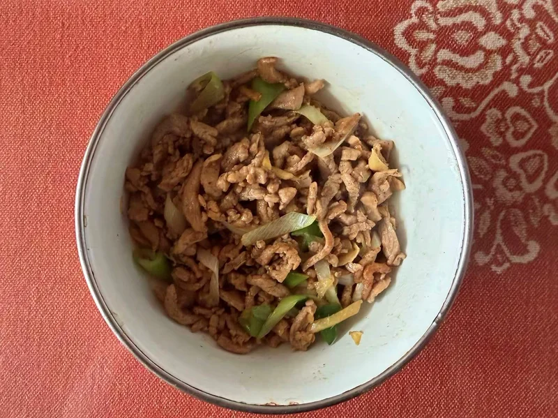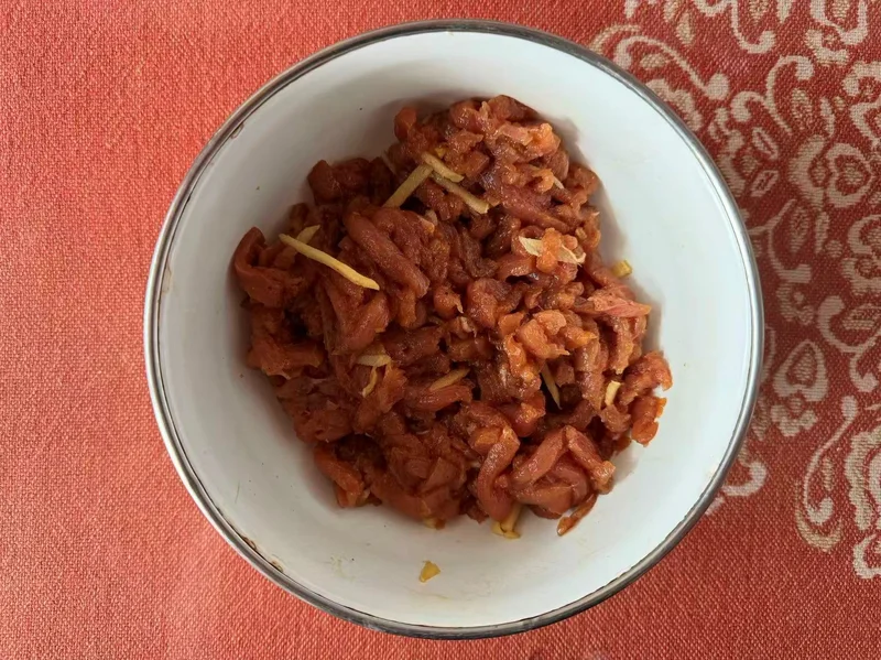 肉丝用盐糖酱油胡椒粉花椒粉大料粉姜丝拌好~