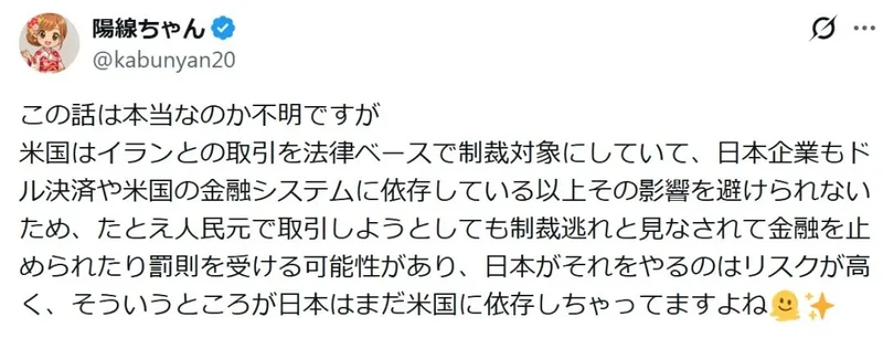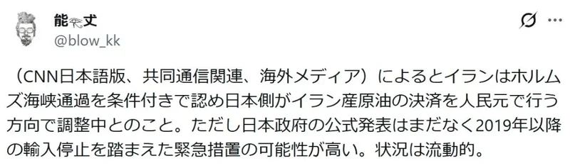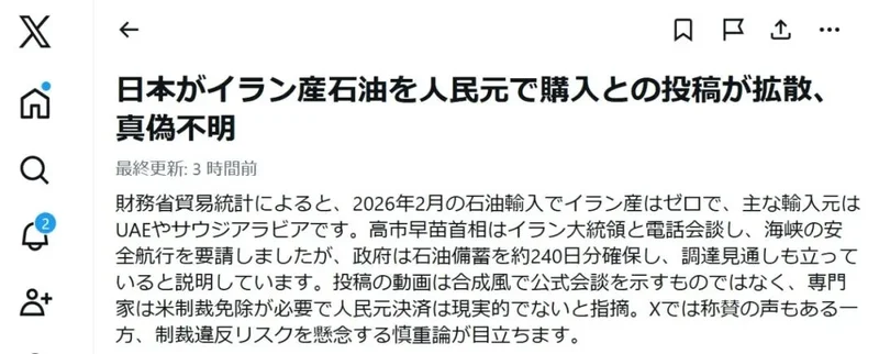 《日本以yuan购买伊朗产石油的投稿扩散,真伪不明》