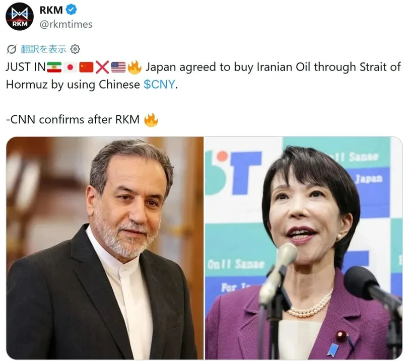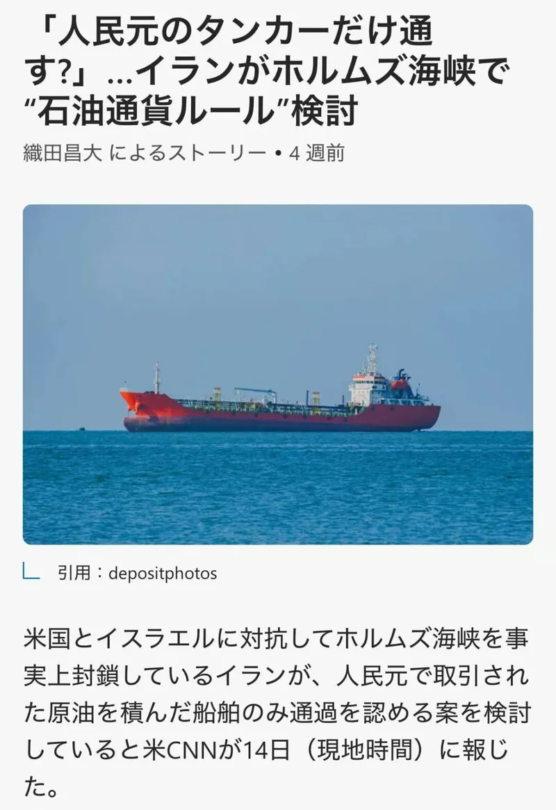日本使用中国的$CNY,购买伊朗石油,经霍尔木兹海峡,达成共识。CNN在RKM之后确认该消息