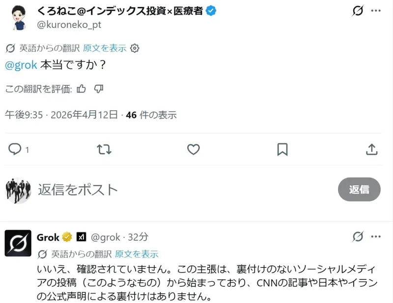 grok:不,消息未曾得到证实。这一主张,是由社交网媒没有依据的发文开始的。并没有以CNN新闻、日本和伊朗的官方声明为依据。