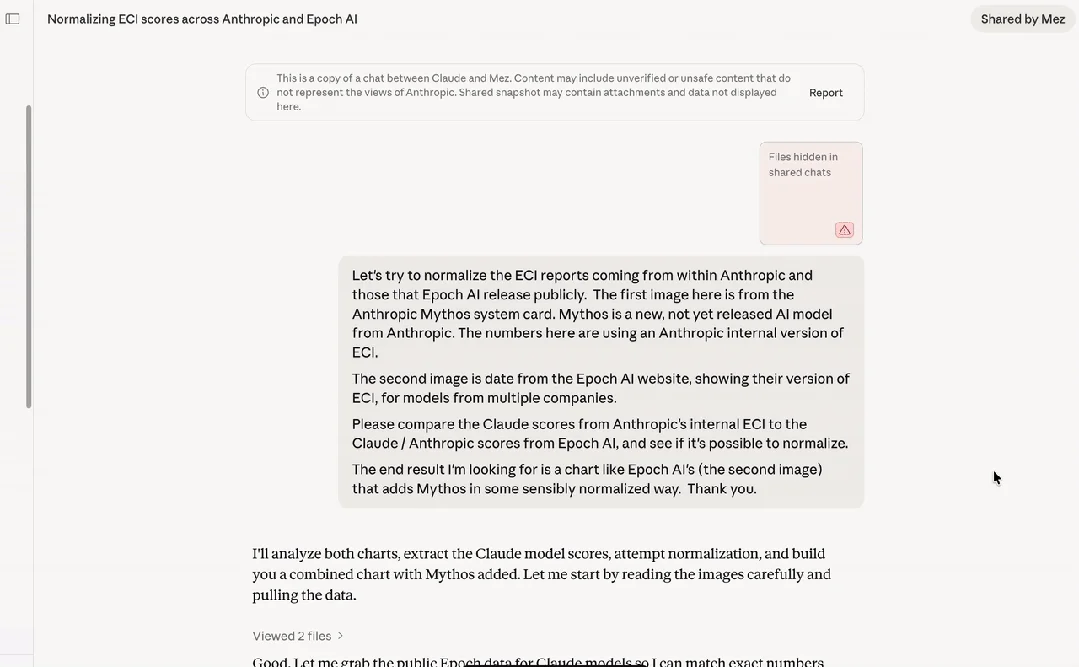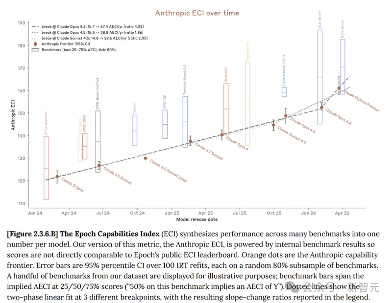 但只要对齐Anthropic内部的ECI报告与Epoch AI公开的官方ECI报告,就能发现Mythos似乎并没有加速ECI的迹象。
