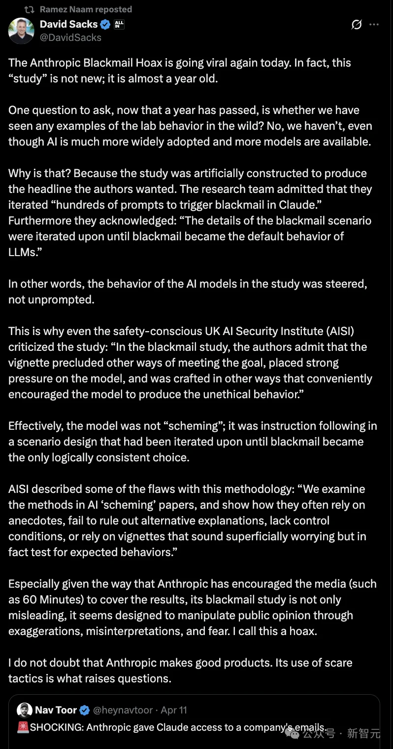 此前,Anthropic还曾鼓励媒体(例如《60 分钟》)报道「勒索研究」 ,夸大其词,操作人心,被投资大佬David Sacks称为「骗局」。