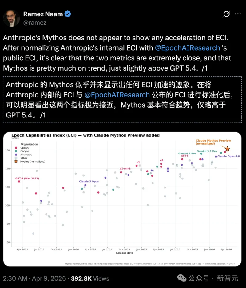 在Epoch能力指数(Epoch Capabilities Index,ECI)上,Mythos并没有加速趋势,只比GPT 5.4强一点。