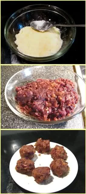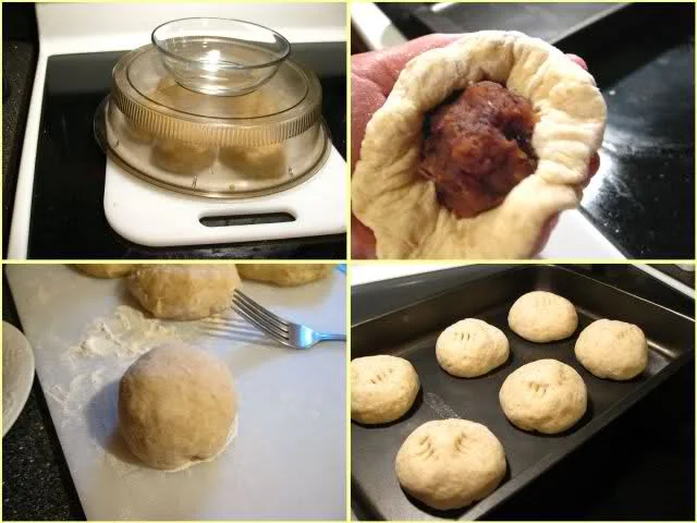 C 内馅:红豆沙110g,土豆泥50g,无盐黄油15g,红糖粉惹干(调制过程在可以试味,够甜为止,因我预先制作的红豆沙已有糖粉,分量很难算出,就用试味的方法来衡量吧)。