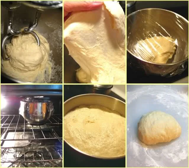 六、取出面团放在案板上搓,排气,我们能听见气孔发出的“吱吱吱”的声音,排到差不多了,放回容器内,再盖上湿布或薄膜,醒发20分钟;