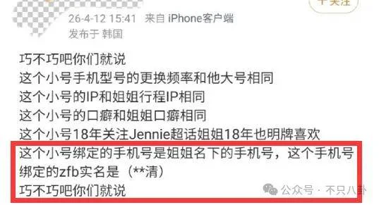 比如这个小号的手机型号更换频率跟宋祖儿对得上,ip地点对得上,粉丝说就连“口癖”都相同。