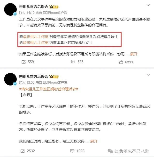 宋祖儿官方后援会连发两条声明,斥责宋祖儿工作室在这次舆情中的消极应对的态度,并要求工作室必须对造谣者采取法律手段。