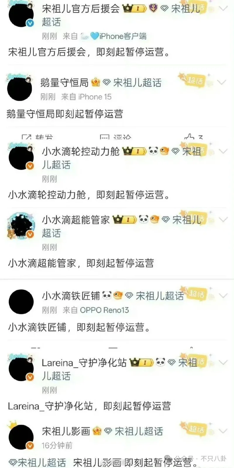 面对工作室的无视,粉丝也说到做到,以宋祖儿后援会为首的几个粉丝职能账号,都宣布暂停运营,并且换了黑色头像。