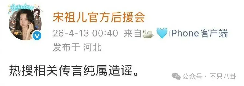 最先出来回应此事的是宋祖儿粉丝后援会,称热搜上的内容都是造谣。