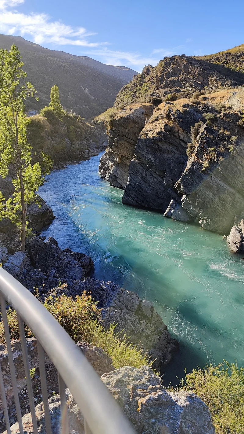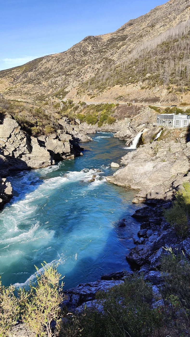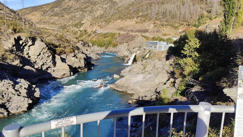 阿立注:水电站的上游是卡瓦劳河(Kawarau River)全长60多公里,源头是新西兰最长的湖,卡娃蒂普湖(Lake Kawatipu)。怒吼的河流由水电站前方3.6公里处10米高的‘怒吼的河流大坝’(Roaring Meg Dam)咆哮而下。。。兵分两路,两个怒吼的河流瀑布(Roaring Meg Waterfalls)为两个水电站提供能源。