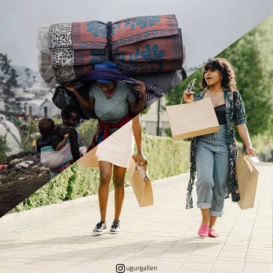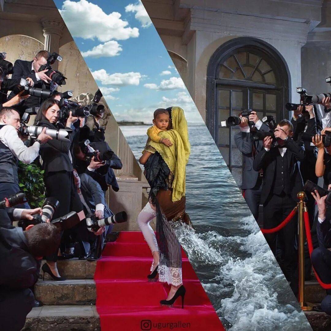 当然,这两幅照片也有一些相似之处,那就是照片中人物相似的动作,或类似的行为,从而进行对比和拼接。例如:排队行走的模特与排队寻找避难所的流民;穿着漂亮裙子微笑的女孩与衣不遮体哭泣的男孩;抱着孩子感受幸福的母亲与另一位失去孩子陷入悲痛的母亲......诸如此类的对比,进一步放大了世界巨大的鸿沟和现实的残酷。