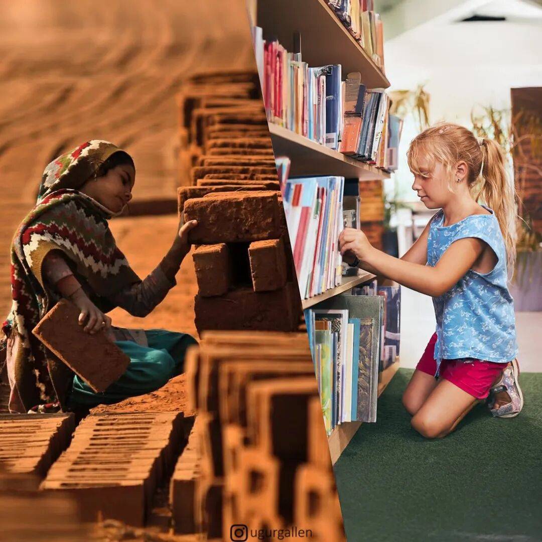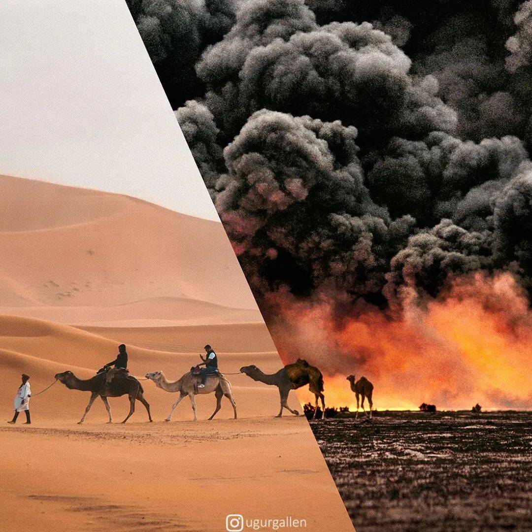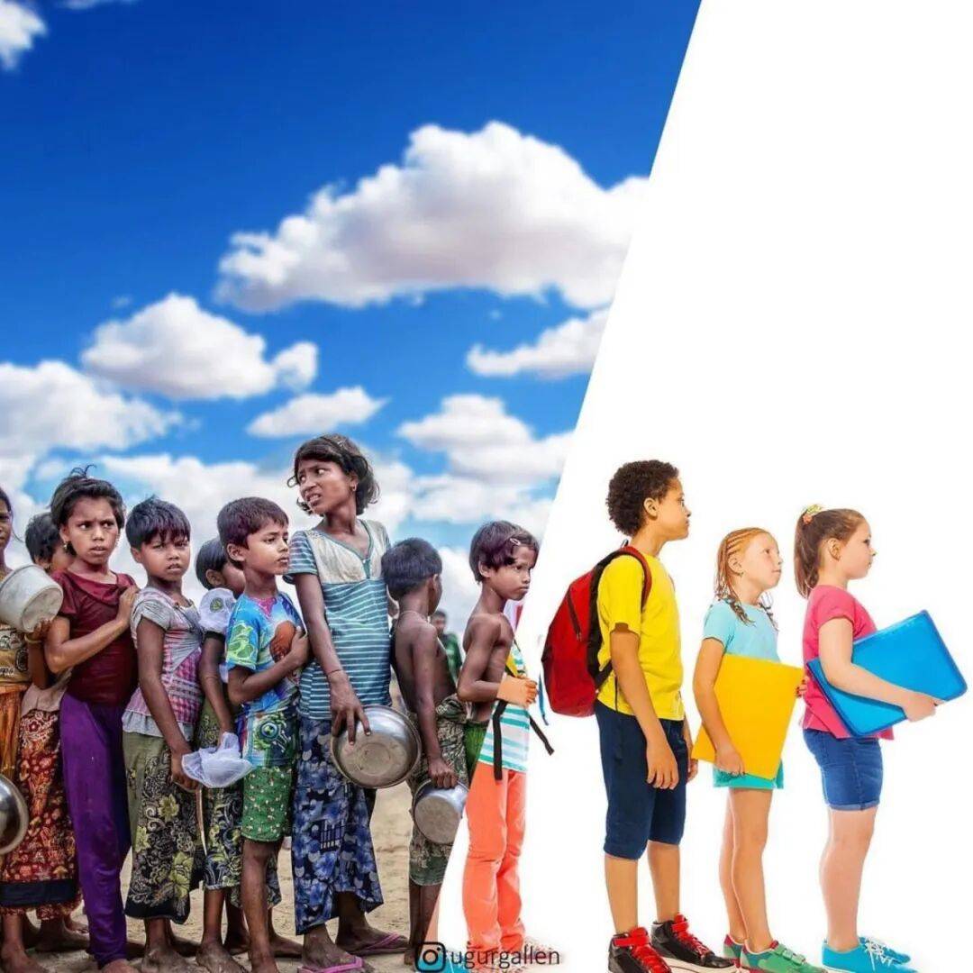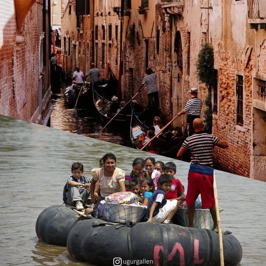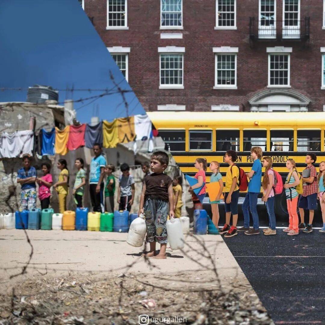 乌古尔·加伦库什的数字拼贴作品,能触动人心的关键就在于,他将两幅完全不同,甚至可以说毫不相干的照片,硬生生地拼到了一起。通常情况下,这两幅照片,一幅展现的是西方社会奢华、安逸、舒适、愉悦的生活写照,而另外一幅照片,则是因战争陷入贫困、残疾、饥饿和承受巨大痛苦的平民。