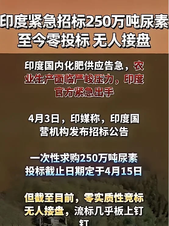 莫迪最近怕是有点懵。今年春耕在即,印度农民盼尿素盼断肠,印度对外放出大招:全球招标,买250万吨尿素。这数字,听着就吓人,全球尿素贸易一年也就几千万吨,你一口吃掉十分之一。