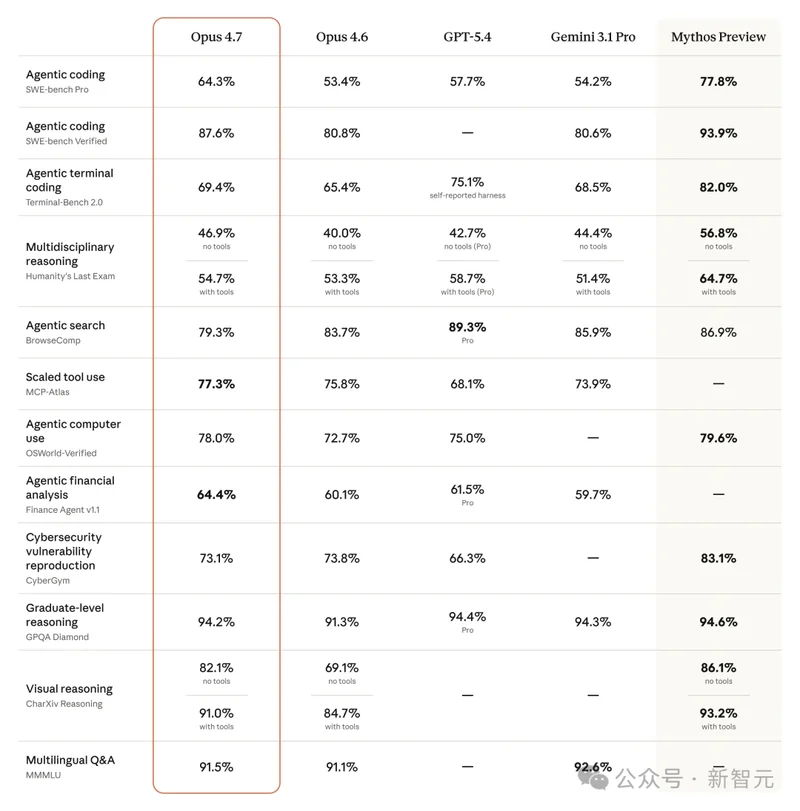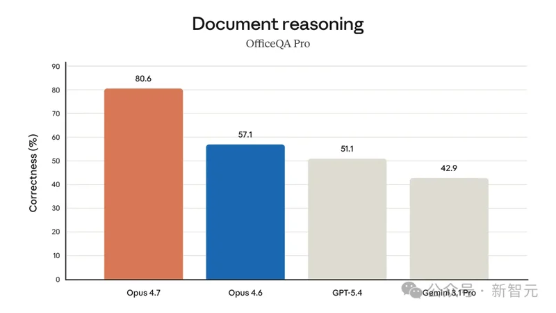 在这里,Opus 4.7 的跑分高达 80.6%,而 Opus 4.6 只有 57.1%,GPT-5.4 和 Gemini 3.1 Pro 更低,分别是 51.1%和 42.9%。