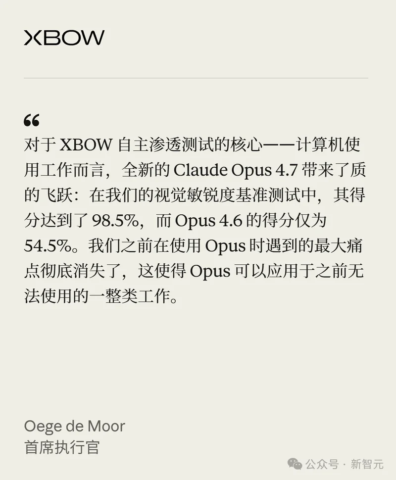 视觉能力在一些测试(如XBOW的基准测试)中,Opus 4.7相比Opus 4.6得分直接翻倍,从54.5%跃升到接近满分98.5!