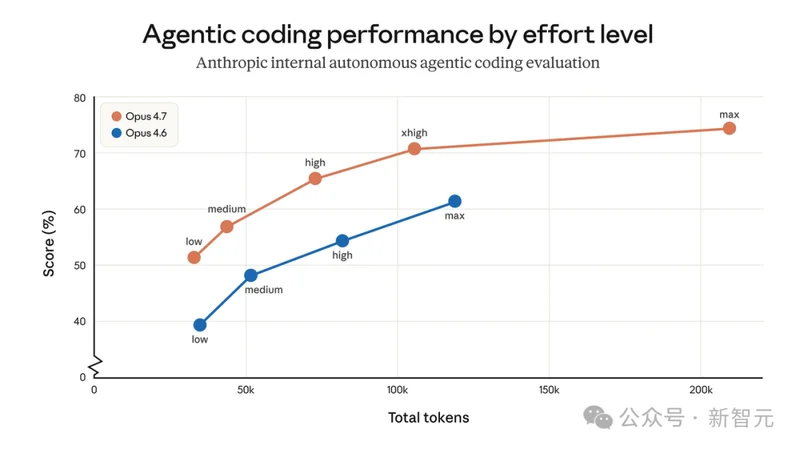 Opus 4.7 还换了分词器(Tokenizer),同样的输入可能会多出大约 1.0 到 1.35 倍 Token,高 Effort 下输出 Token 也会增加。