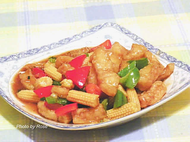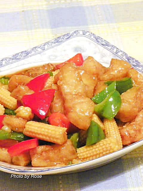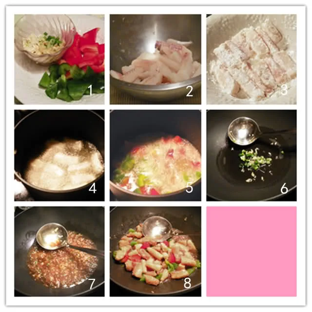 八、倒入鱼块、菜椒和玉米芯,快速兜匀,上碟。