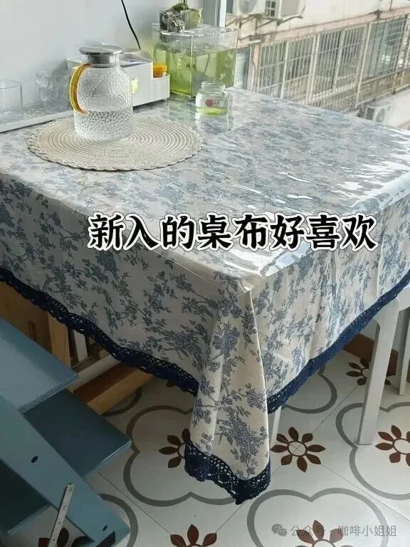 蓝白碎花,蕾丝边,压着一块透明软玻璃防水。桌上放了玻璃茶壶,泡着什么绿色的东西,两个杯子。