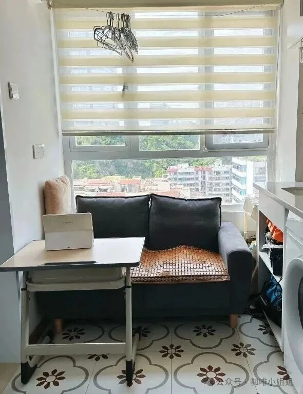 一张双人小沙发,一张折叠小桌,花砖地面,斑马帘半拉着,窗外是香港密密麻麻的楼和一片绿。衣架挂在帘轨上,随手一搭。