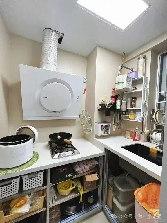 开放格比封闭柜有一个很实际的好处,就是拿东西快。不用开门、不用弯腰去摸,眼睛扫一下就知道在哪儿。小厨房里,操作节奏快,这种「一眼看到底」的收纳方式,其实比精致的定制柜更顺手。