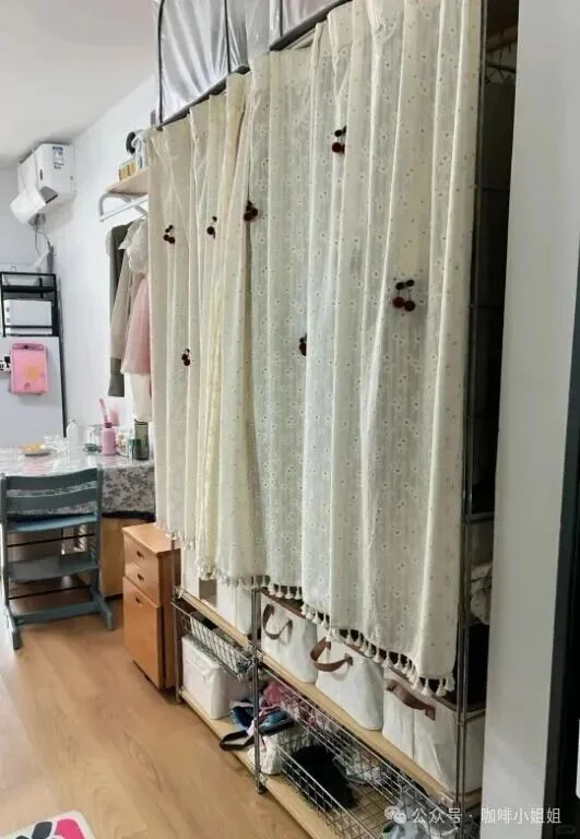 没有定制柜,没有推拉门,就是一组层架,外头挂了一排奶白色的帘子,帘子上有樱桃图案,底下压着收纳袋。